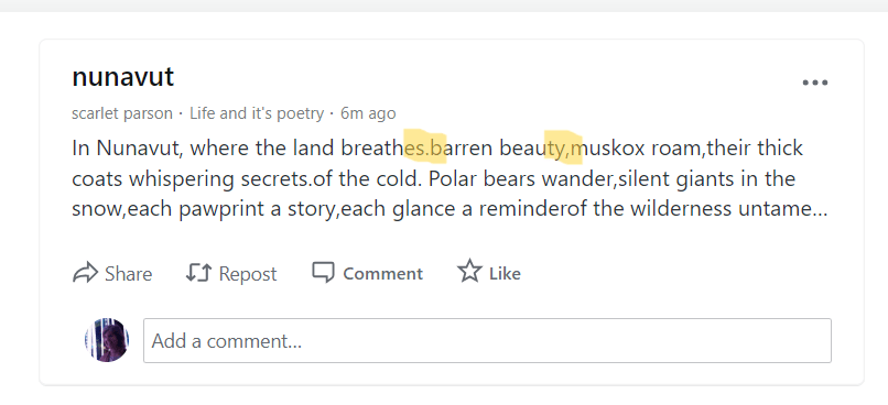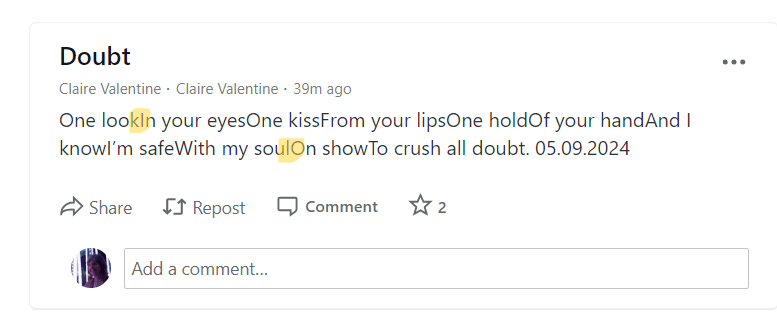 - write a manual blurb, which might be a good chance to sell your poem … but be careful, because you’re asking people to make a mouse click, which can be a roadblock … and if your poem is short, like a haiku, having it right there in the preview pane will lead to more people reading it. You may even know they have, because it’s easy for someone to just click like and then keep scrolling through their reader feed