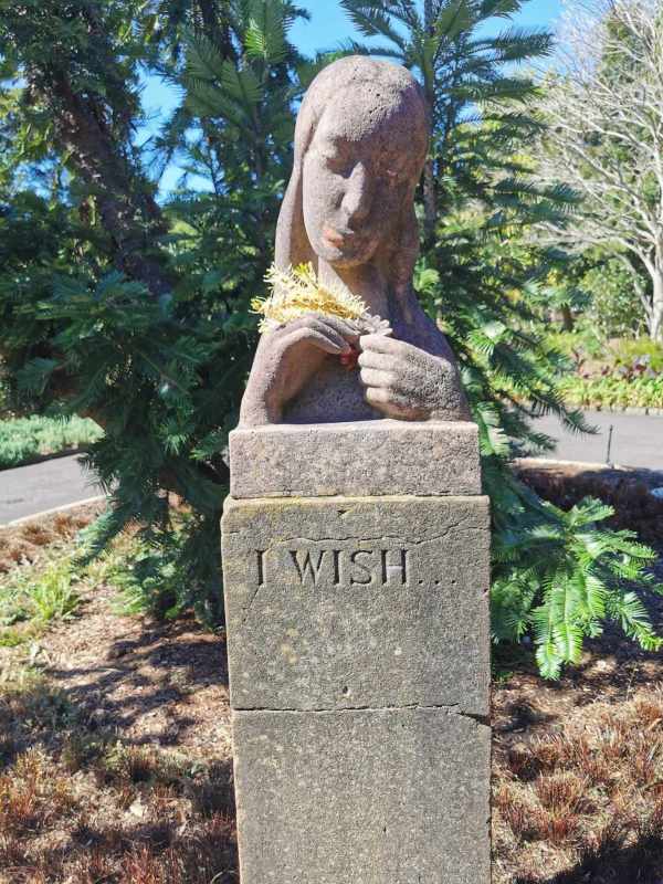 - Photograph taken by Kari McKern at Royal Botanic Garden Sydney after a ginko (haiku walk) led by Eileen Chong and Red Room Poetry for World Poetry Month on 30 August 2024. Kari composed this haiku on the morning of the ginko, before leaving home. The photo shows a sandstone sculpture of a femme head and hands with the words ‘I WISH’ carved below, and in the background a young wollemi pine tree. The sculpture is holding fresh flowers, perhaps a kind of grevillea (please correct me in the comments if you know this flower!) ↩︎
